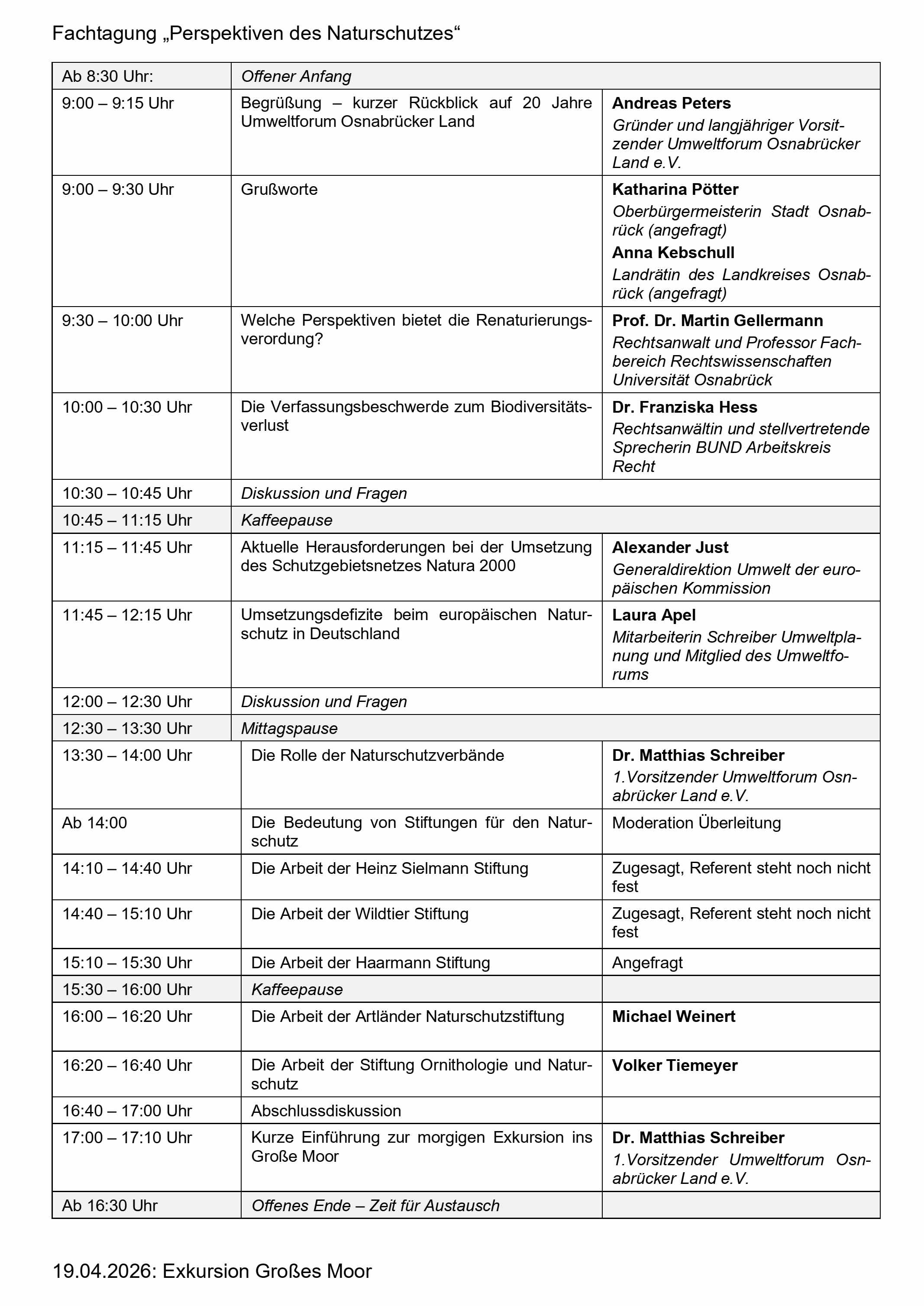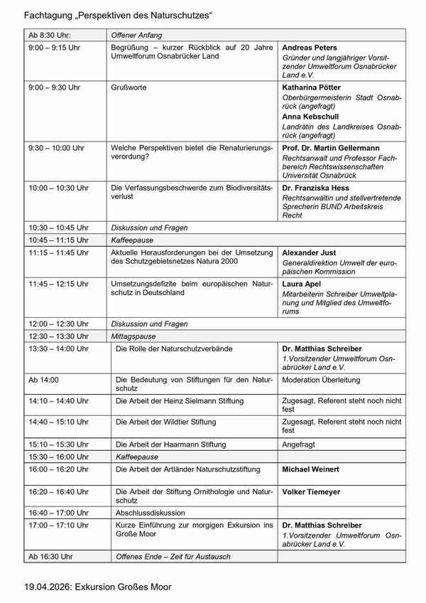 Das Umweltforum Osnabrücker Land möchte im Rahmen einer Tagung Impulse für die künftige Naturschutzarbeit geben. Dabei ist klar, dass eine einzelne Tagung dieses große Feld nicht komplett abdecken kann. Das Tagungsprogramm greift deshalb ausgewählte Facetten auf. Wie dem vorläufigen Programm im Anhang zu entnehmen ist, werden vier Referentinnen bzw. Referenten verschiedene Themenfelder beleuchten. Dabei geht es in 2 Beiträgen um den Stand der Umsetzung des europaweiten Schutzgebietsnetzes Natura 2000. Es folgen zwei Beiträge, die die neuen Rahmenbedingungen beleuchten: die 2024 verabschiedete Renaturierungsverordnung der EU sowie die Folgen der diversen Beschleunigungsgesetze auf nationaler Ebene.