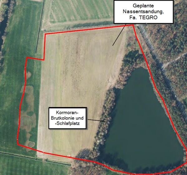 Die TEGRO Sand- und Kiesgewinnung GmbH, Heek, plant seit geraumer Zeit die Wiederaufnahme einer Nassentsandung in der Samtgemeinde Schüttorf, genau dort, wo sich die einzige bekannte Brutkolonie des Kormorans im gesamten Kreisgebiet befindet. Durch die geplante Erweiterung der Sandabgrabung käme es zur kompletten Zerstörung der Brutkolonie und des jährlich in vielen Monaten besetzten Schlafplatzes: Nicht nur das von den Vögeln besiedelte Gehölz würde vollständig beseitigt, sondern der bereits existierende kleine See würde über den von den Kormoranen genutzten Bereich hinaus deutlich vergrößert werden (s. Planskizze).