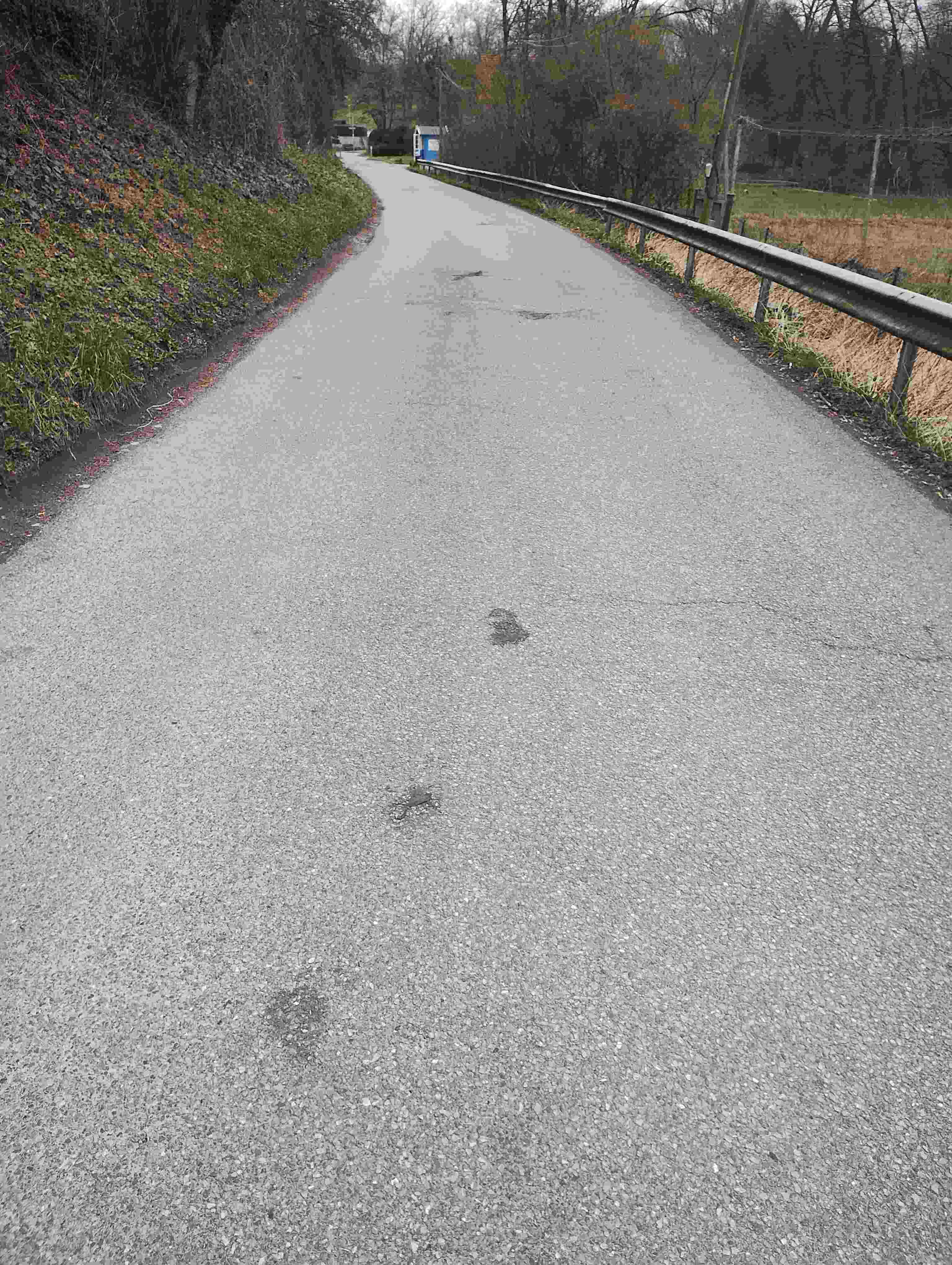 Beim täglichen Kontrollieren wurde aber auch sichtbar, dass der Zaun nur einen Teil der Tiere erreichte. An den Enden der Strecke – besonders an der Hofeinfahrt der Forellenzucht, an der Biotopzufahrt und am nördlichen Hang – lagen morgens zahlreiche überfahrene Amphibien. An einem einzigen Tag wurden dort rund 50 tote Tiere gezählt.