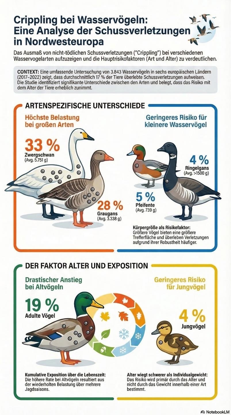 Die Jagd auf Wasservögel muss unter Berücksichtigung des Erhaltungszustands und des Tierschutzes nachhaltig durchgeführt werden, so sehen es Gesetze und internationale Konventionen vor. Schrotmunition wird v.a. bei der Jagd auf Wasservögel benutzt. Dabei enthält eine Patrone bis zu 300 kleine Schrotkörner, die sich wie Streumunition in der Luft verteilen. Dabei nimmt die Dichte sowie die kinetische Energie mit der Entfernung ab, so dass die Jagd nur bis zu einer Höhe von max. 35-40m als „waidgerecht“ i.S. des BJagdG gilt. Darüber werden Vögel zwar von Schrotkugeln getroffen, aber nicht getötet. Diese werden von Jägern als „angebleit“ bezeichnet, erleiden durch die Schrote im Körper Verletzungen und Verkrüppelungen (engl. „crippling“). Dieses kann zu einem späteren Tod irgendwo im Schilf, nur chronischen Verletzungen oder generell verminderter Fitness führen. In einer umfangreichen Studie untersuchten Wasservogelforscher aus den Niederlanden, Schweden, Dänemark und Deutschland die Anteile angeschossener Wasservögel in ihren Fängen. Die Vögel wurden nach der Beringung geröntgt und so der zum Anteil Vögel mit eingeschossenen Schrotkugeln ermittelt. Die Studie umfasste Individuen aus neun Wassergeflügelarten in sechs europäischen Ländern im Zeitraum 2017–2022. Insgesamt wurden 3.843 Individuen geröntgt, von denen 17 % angeschossen waren. Logistische Regressionsmodelle zeigten, dass das Risiko einer solchen Verkrüppelung zwischen den Arten variierte und mit dem Alter zunahm, jedoch nicht mit der individuellen Körpermasse innerhalb einer Art. Im Durchschnitt stieg die Verletzungsrate mit der durchschnittlichen Körpermasse der Art; die höchste Rate wurde bei Zwergschwänen und Graugänsen festgestellt, bei denen 33 % bzw. 28 % der Individuen verletzt waren, und die niedrigste Rate bei Pfeifenten und Ringelgänsen, bei denen 5 % bzw. 4 % verletzt waren. Im Durchschnitt trugen 19 % der erwachsenen Vögel eingebettete Schrotkugeln, gegenüber 4 % der Jungvögel im ersten Lebensjahr. Die höheren Verletzungsraten und die höhere Anzahl eingebetteter Schrotkugeln bei Adulten als bei Jungtieren deuteten auf eine kumulative Exposition hin. Die Verletzungsraten von Gänsen unterschieden sich zwischen den Ländern und je nach Populationsstatus, wie das Beispiel der Nonnengans zeigt: 15 % der überwinternden Adulten waren in den Niederlanden verletzt, gegenüber 9 % in Deutschland, und 15 % der Erwachsenen der Winterzugvögel gegenüber 21 % einer intensiv verfolgten residenten Population in den Niederlanden. Die gemeldeten Verletzungsraten liegen im Bereich der zuvor gemeldeten Verletzungsraten von Gänsen und Schwänen, einschließlich hoher Raten für Zwergschwäne und Nonnengänse, die in einem Teil ihres Verbreitungsgebiets geschützt sind. Insbesondere diese beiden Arten stehen unter dem strengen Schutz der EU-Vogelschutzrichtlinie und sind im Geltungsbereich der EU nicht jagdbar (wenngleich Nonnengänse in erheblichen Maß „zur Abwehr landwirtschaftlicher Schäden“ in zahlreichen EU-Ländern beschossen werden). Nicht zuletzt sind es diese Schrote aus der Wasservogeljagd, die heute noch maßgeblich zu Vergiftungserscheinungen bei Prädatoren wie z.B. beim Seeadler führen.